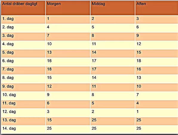 Skemaet skal følges nøje. Efter dag 14, skal du fortsætte med 25 dråber 3 gange dagligt indtil der ikke er mere tilbage.